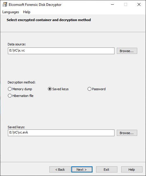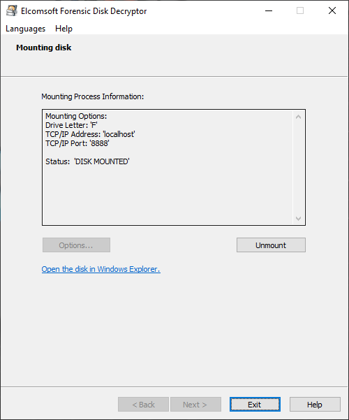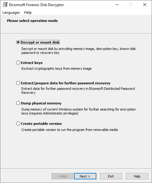 Запустите Elcomsoft Forensic Disk Decryptor. В главном окне выберите опцию Decrypt or mount the disk.