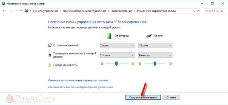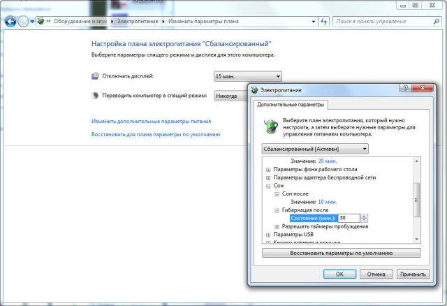 Кроме того, компьютер переводится в режим пониженного энергопотребления, если мы определенное время не работаем на нем. Время бездействия и особенности перехода в сон или гибернацию настраиваются через “Изменение параметров энергосбережения” (Панель управления —> Оборудование и звук —> Электропитание).