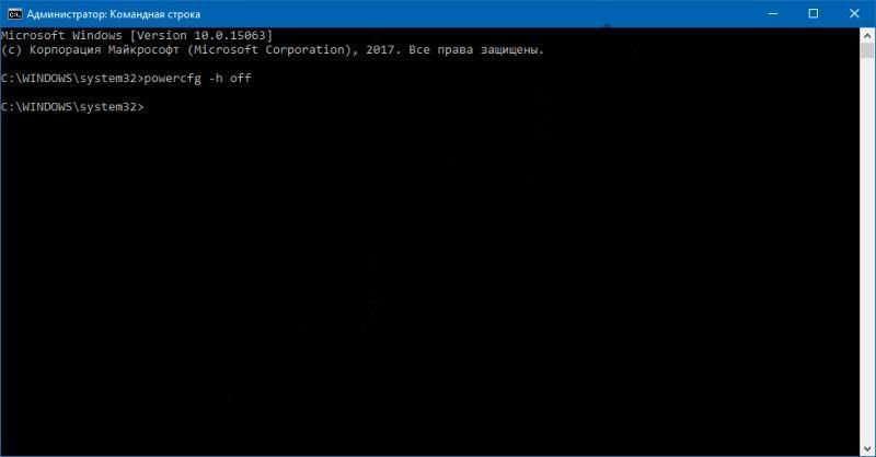Для выключения гибернации необходимо также выполнить команду powercfg -h off