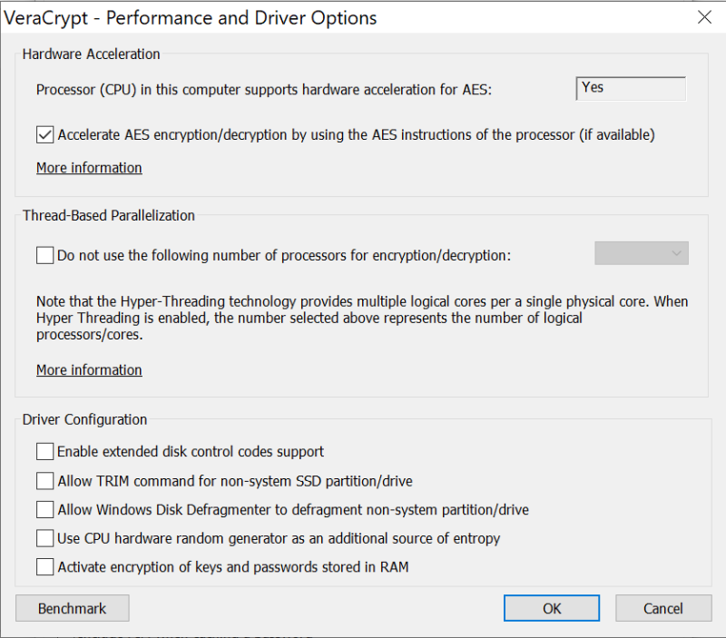 После активации этой настройки (и перезагрузке VeraCrypt) приложение будет хранить ключи шифрования в оперативной памяти в защищённом виде. Утечку ключей в файл гибернации и файл, создаваемый для «быстрой загрузки», разработчики VeraCrypt решили предельно прямолинейно путём отключения обеих функций на уровне системных настроек. В журнале howtogeek приводится объяснение: