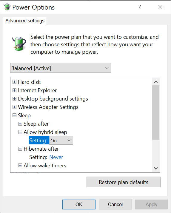 Режим сна — первый из энергосберегающих. По умолчанию в Windows 10 включён режим так называемого «гибридного» сна (см. скриншот), однако пользователь может вручную изменить эту настройку.