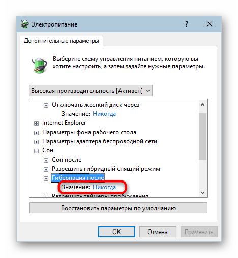 - Последним шагом нажимаем на «Разрешить гибридный спящий режим» и выбираем в обоих разделах «Выкл».
