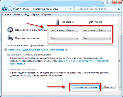 Для владельцев ноутбуков можно перейти в любой из режимов просто закрыв крышку или нажать кнопку отключения, естественно заранее должны быть произведены соответствующие настройки в разделе Электропитание… Заходим в «меню пуск» \ Панель управления»\ Система и безопасность»\ Электропитание После выбираем «Действие кнопки питания»