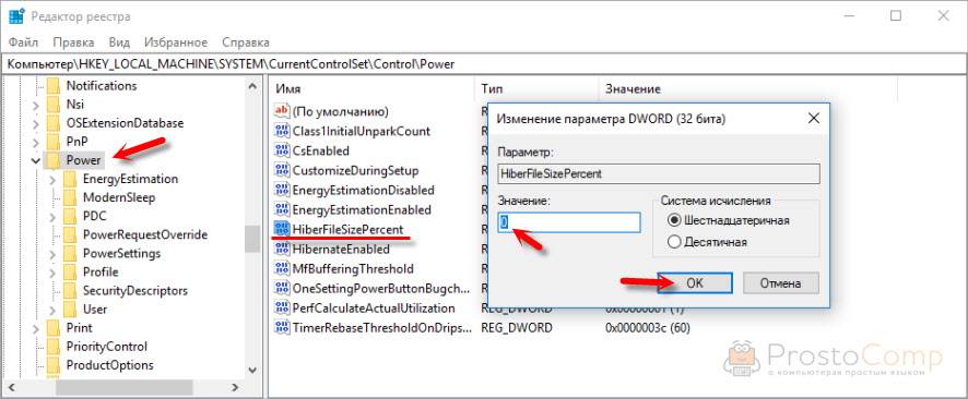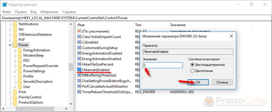 Переходим к параметру «HibernateEnabled» и так же меняем значение на «0», «ОК». Закрываем редактор реестра.