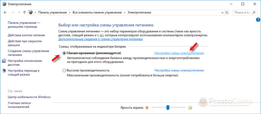 - Открываются настройки электропитания, где напротив пункта «Сбалансированный (рекомендуется)» нажимаем ссылку «Настройка плана электропитания».