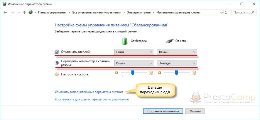 Кроме того, компьютер переводится в режим пониженного энергопотребления, если мы определенное время не работаем на нем. Время бездействия и особенности перехода в сон или гибернацию настраиваются через “Изменение параметров энергосбережения” (Панель управления —> Оборудование и звук —> Электропитание).