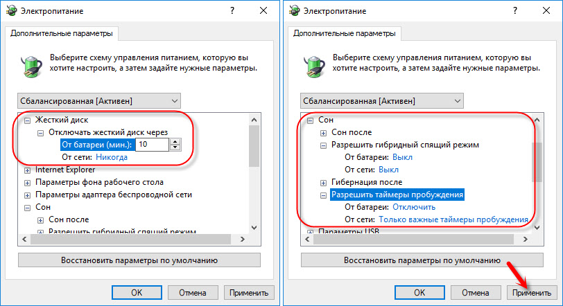 - Последним шагом нажимаем на «Разрешить гибридный спящий режим» и выбираем в обоих разделах «Выкл».