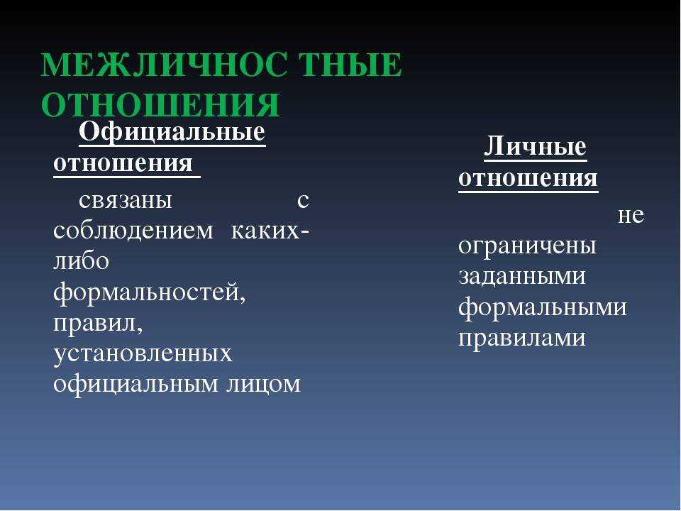 Термин «межличностные» несет в себе понимание того, что отношения человека и другого индивида имеют взаимную направленность. Межличностные отношения – это система установок ожиданий и ориентаций членов определенной группы относительно друг друга, обусловленных организацией совместной деятельности и базирующиеся на общих представлениях о ценностях и общественных нормах.