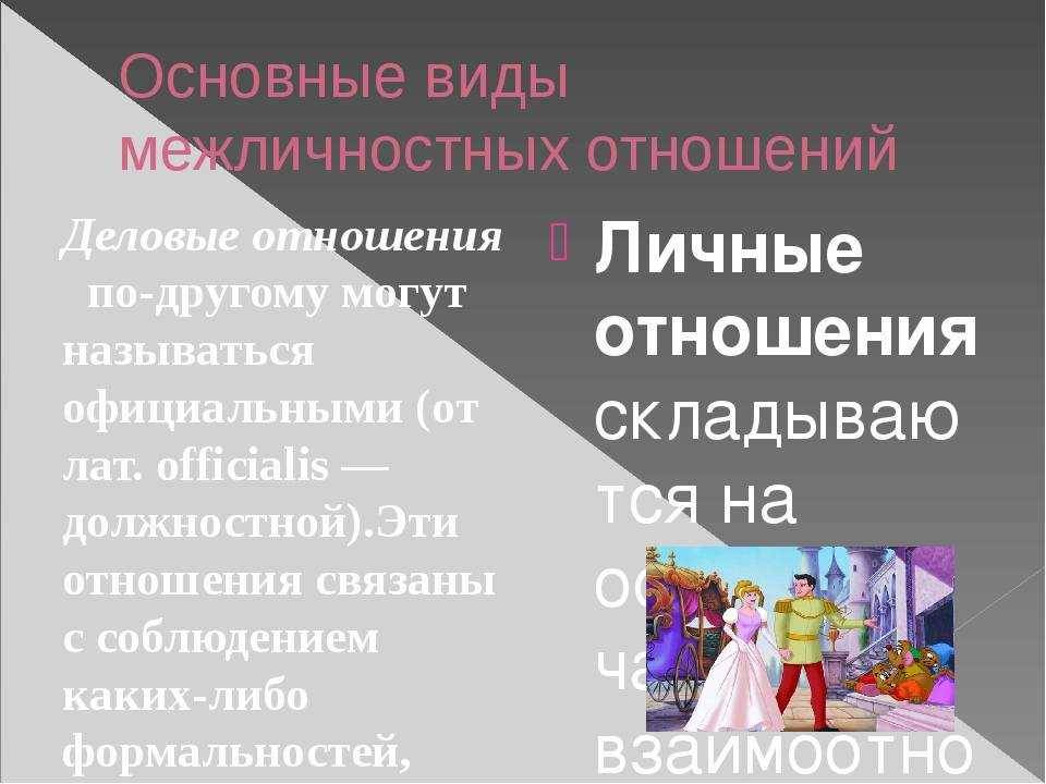 Исходя из названия можно понять, что личные отношения – это общение между людьми, то есть личностями, основанное на индивидуальных психологических особенностях. Главными факторами, которые лежат в основе этого вида отношений являются чувства – интерес, в первую очередь