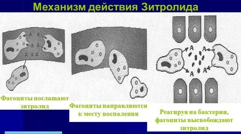 Лекарство имеет 3 форма выпуска: таблетки, инъекционный раствор и порошок, из которого готовится суспензия. В роли действующего вещества выступает дигидрат азитромицина в разной концентрации. Антибактериальное действие препарата достигается благодаря способности медикамента подавлять синтез белка, притормаживать рост и размножение патогенных микроорганизмов.