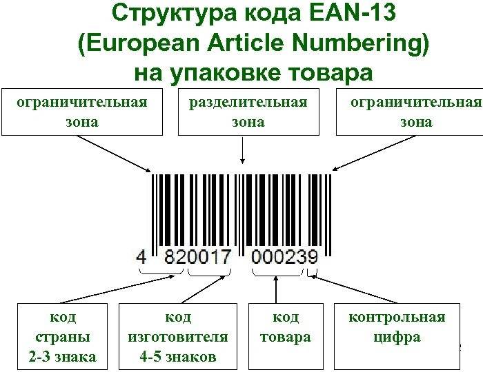 Штриховой код EAN-13 под черными вертикальными полосами содержит 13 цифр, из которых первые 3 означают страну, следующие 4 или 5 – производителя, оставшиеся – код товара и контрольное число. Малый формат кодировки EAN-8 имеет то же наполнение, за исключением данных о производителе.