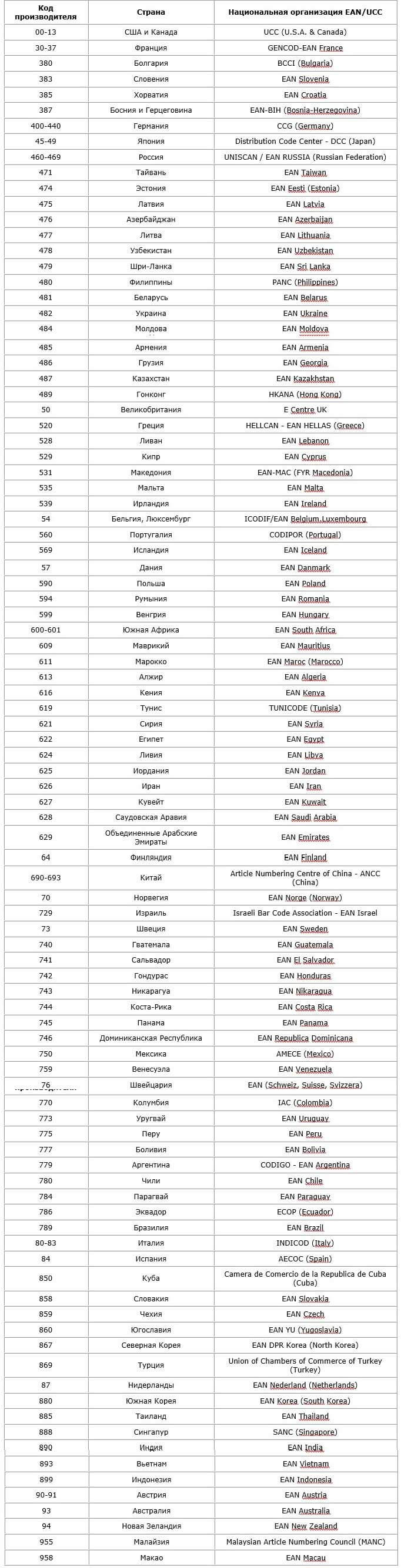 Таблица штрих-кодов стран производителей