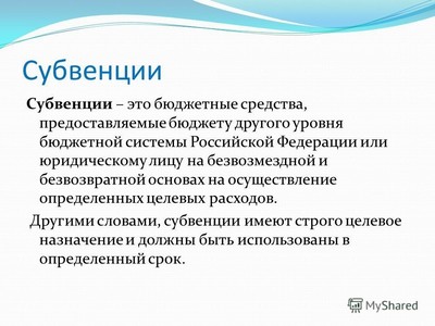 Субвенция – выделяемые из бюджета любого уровня деньги, потратить которые можно на строго определенную цель.