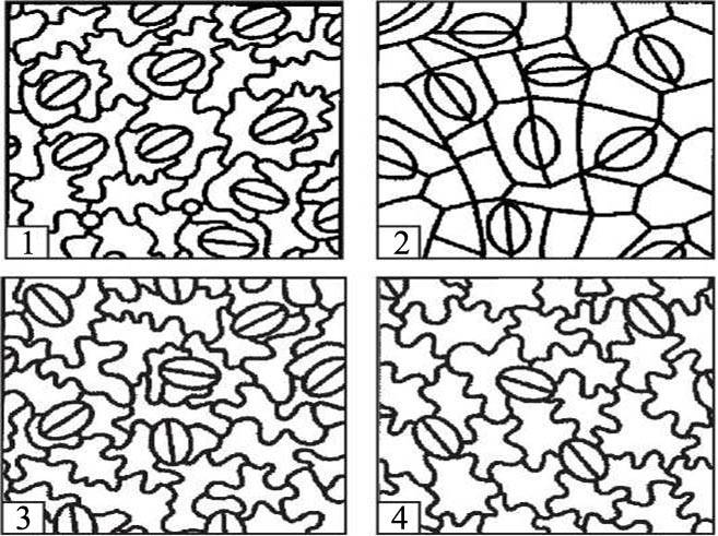 Рисунок 2: Основные типы устьичных аппаратов. 1 – диацитный; 2 –парацитный; 3 –анизоцитный; 4 — аномоцитный.