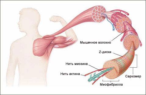 Мышечное волокно поперечно-полосатой ткани покрыто оболочкой — сарколеммой. Под оболочкой находится цитоплазма с большим количеством ядер, расположенных по периферии цитоплазмы, и сократительными нитями — миофибриллами. Миофибриллы состоят из белков: актина (тонкие нити) и миозина (толстые нити).