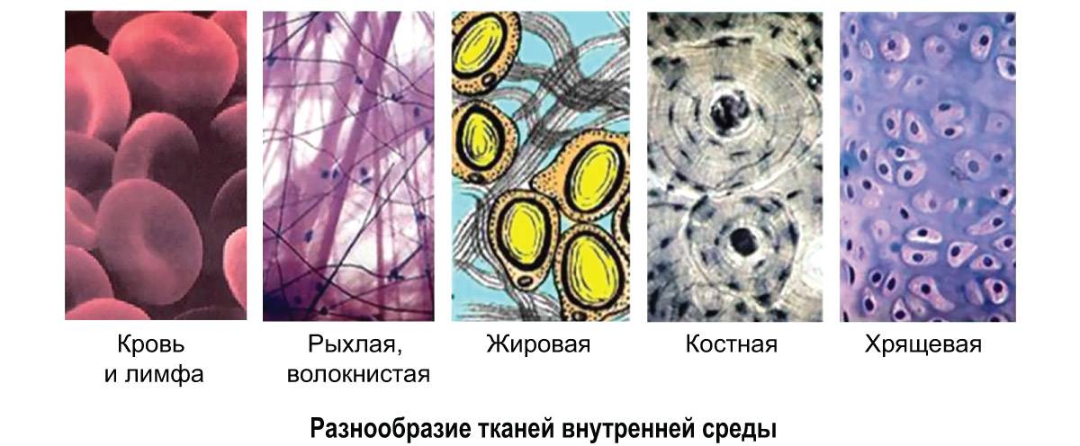 Ткани внутренней среды очень разнообразны по строению, но общей чертой для них является рыхлое расположение клеток и наличие хорошо выраженного межклеточного вещества, представленного либо волокнами белковой природы, либо аморфным веществом. Межклеточное вещество может быть твердым (кость), жидким (кровь) или упругим (хрящ).