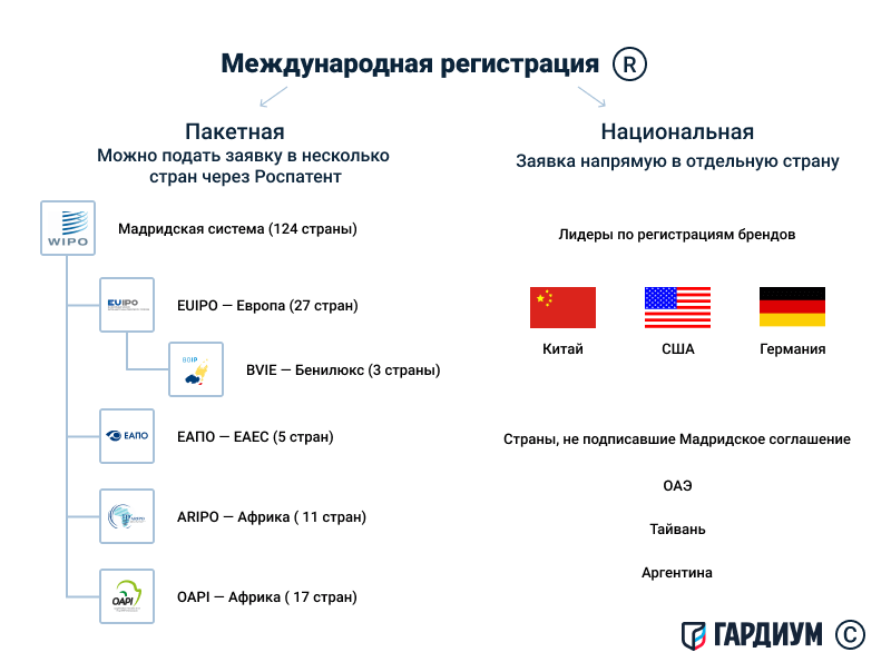 Международная регистрация товарного знака может быть пакетная или национальная. Источник