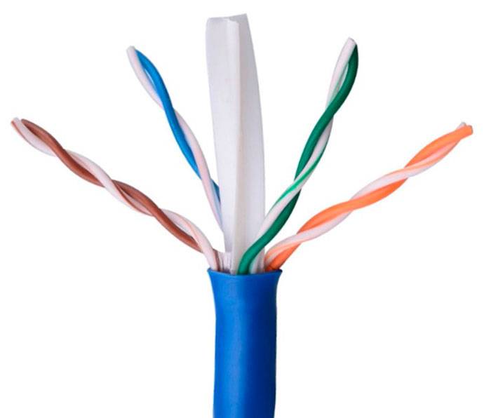 Кабеля 5е и 6 состоят из четырех витых пар (8 скрученных проводников) и тонкой нити между ними.