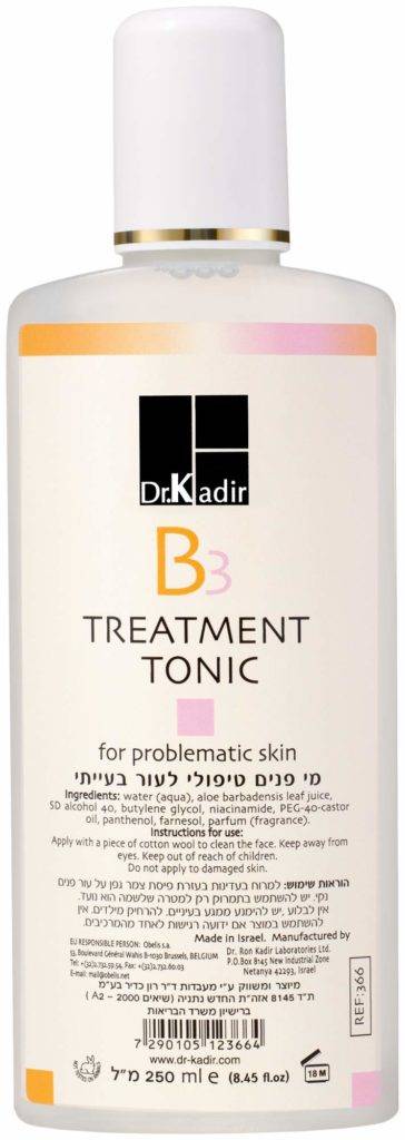 Израильский бренд Dr. Kadir выпускает профессиональную косметику, которая пользуется популярностью во всем мире. B3 Treatment Tonic For Problematic Skin — антисептический препарат, который эффективно борется с воспалениями и восстанавливает работу сальных желез. В состав входят спирт, пантенол, экстракт алоэ, фарнезол, ниацинамид, SD-40 спирт 10%, активные ингредиенты, а также касторовое масло. B3 treatment tonic for problematic skin подходит для применения как взрослым, так и подросткам. При регулярном использовании дерма приобретает здоровый вид, становится упругой и свежей.