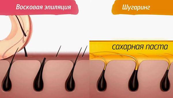 - Техника удаления. В шугаринге волосы удаляют по направлению их роста, а в восковой эпиляции – против. От этого во втором варианте часто происходит обламывание и врастание волос.