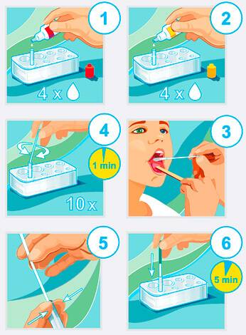 Алгоритм использования стрептотеста: 1. В пробирку наливается 4 капли жидкости из красного флакона; 2. В неё же добавляется 4 капли жидкости из желтого флакона; 3. Содержимое пробирки тщательно перемешивается и оставляется на 1 минуту; 4. С миндалин у больного ватным тампоном на конце палочки снимается порция слизи; 5. Тампон опускается в пробирку, а затем отжимается в неё же; 6. На 5 минут в пробирку опускается тест-полоска.