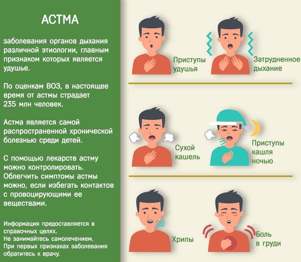 Часто сами пациенты, которых на фоне интенсивного кашля беспокоит одышка, приписывают подобную симптоматику бронхиальной астме. Но при этом отсутствует спазм бронхов, что является ключевым признаком этого заболевания. Кроме того, приступы астмы сопровождаются не только нарушениями со стороны дыхательной системы, часто они связаны с воздействием конкретного триггера, то есть аллергена. Эту роль могут сыграть: