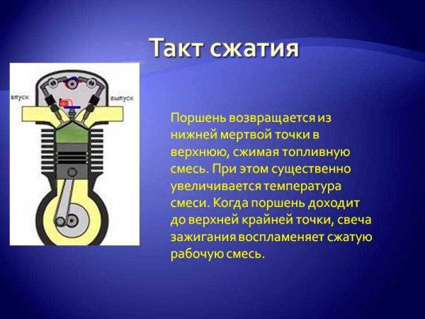 Далее идет такт сжатия, при котором поступившая смесь сжимается в объеме. Делается это для того, чтобы в меньшем объеме образовалось больше горючей смеси.