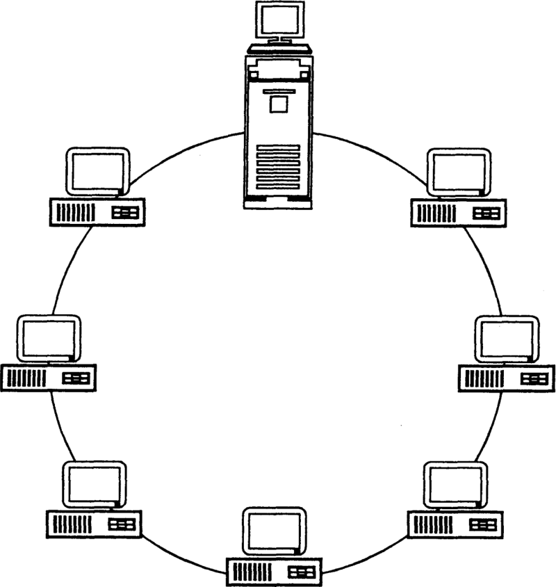 Кольцо. В сетях с топологией «кольцо» компьютеры связаны один с другим, при этом первый компьютер связан с последним. Сигналы передаются по кольцу в одном направлении и проходят через каждый компьютер.