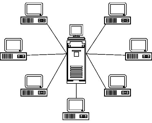 Данный вид соединения характеризуется наличием сервера, к которому подключаются все сетевые устройства. Доступ к информации и обмен ею происходит только при помощи центрального сервера.