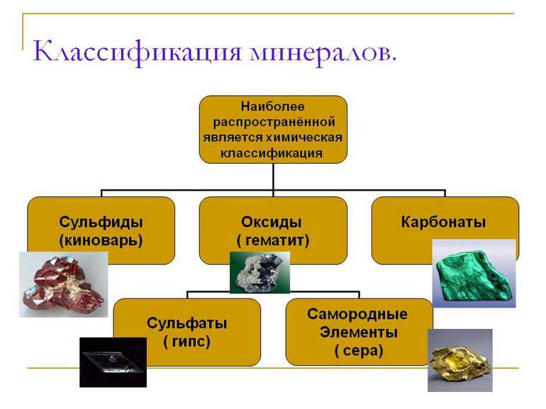 В составе сульфидов содержится сера, а сульфатов — соли и её кислоты. К первой группе относятся пирит и киноварь, а ко второй — гипс и ангидрид. Галоиды и фосфаты — это соли галоидной и фосфорной кислоты соответственно. Первый класс включает сильвин и флюорит, а второй — апатит и фосфорит. Вольфраматы — это соли вольфрамовой кислоты. Определение самородных элементов также связано с их свойствами. Это минералы, включающие только какое-то одно составляющее: золото, алмаз, серу.