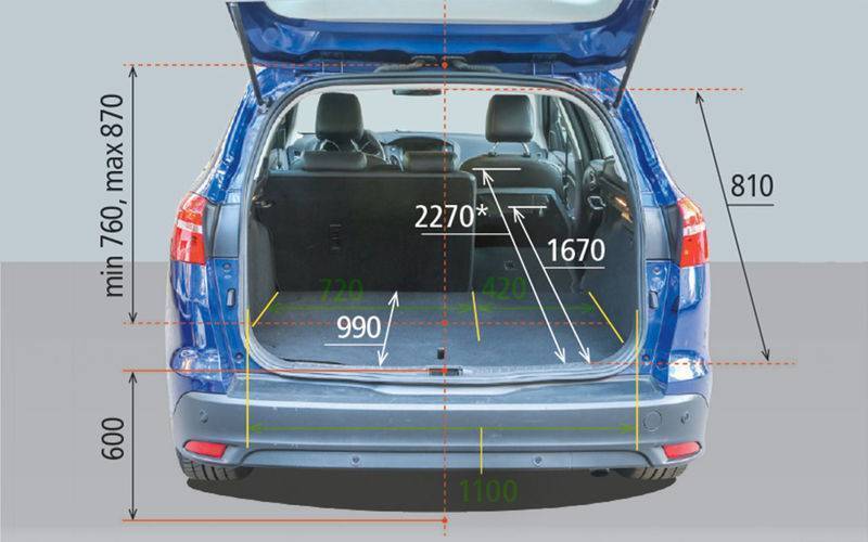 - Длина багажника: в среднем около 0,9 — 1,1 метра (при сложенных задних сиденьях)