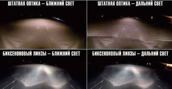 Фото: разница между ксеноновыми, биксеноновыми лампами и штатной оптикой