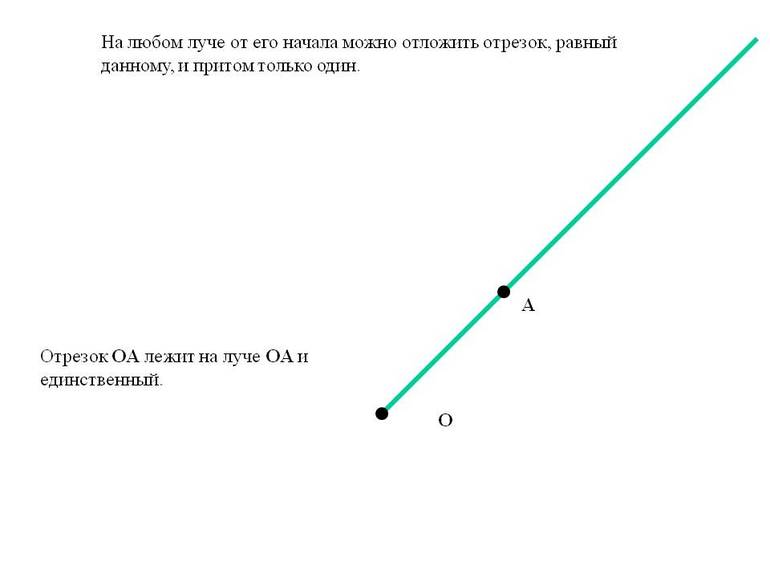 Свойства лучей определяются аксиомами. Положение 1: на любом луче от начала можно отложить отрезок определённой длины, и только один.
