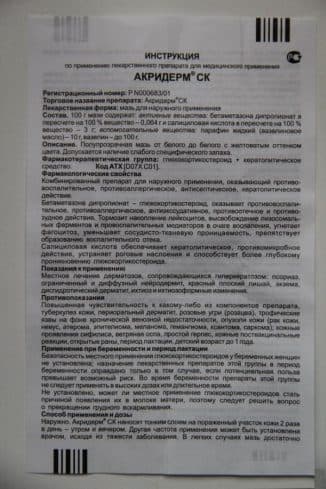 Вопрос от чего помогает Акридерм часто возникает у людей, страдающих от тяжелых заболеваний кожи, таких как лишай. При этом заболевании мазь Акридерм ГК эффективна тем, что она хорошо снимает воспаление и зуд, уничтожает грибковую и бактериальную инфекцию, снижает отек. Можно наносить при лишае и Акридерм СК – эта мазь поможет избавиться от утолщений кожи. Наносить мазь нужно только на пораженные лишаем участки кожи. Длительность лечения – 2 недели.