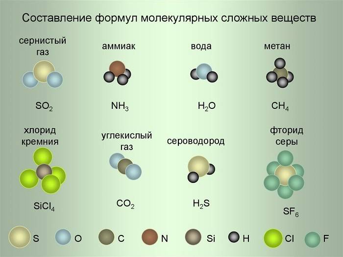 Молекула сернистого газа SO2 состоит из одного атома Серы и двух атомов Кислорода. Молекула аммиака состоит из одного атома Азота и трёх атомов Водорода и т. д.