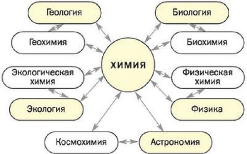 Чтобы овладеть химическими знаниями, необходимо изучить физику, биологию, а также математику. Как видно из схемы, химия тесно перекликается с другими науками.