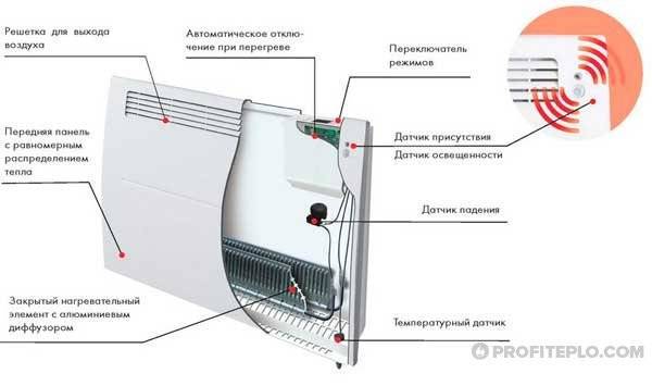 Большинство моделей конвекторов снабжены защитой от перепадов напряжения, от перегрева, оснащены датчиками положения, отключающими агрегат при падении или наклоне.