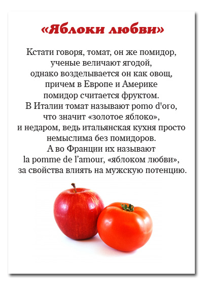 Французы же первыми увидели ярко-красные помидоры и назвали их pomme d’amour, что в переводе значит «яблоко любви». Хотя сегодня чаще используют tomate.