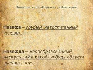 Невежа — это человек, не только необразованный, но и грубый в общении. Он не только не интересуется новым, а еще и пренебрежительно относится к людям, у которых этих знаний больше.