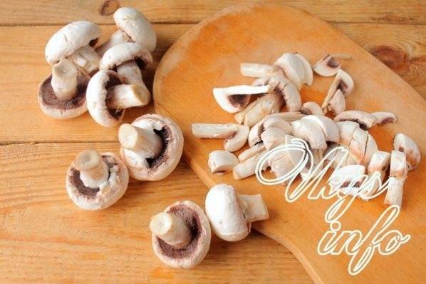 - Подготовленным шампиньонам придать форму пластин, толщина которых не должна быть меньше 3 мм.