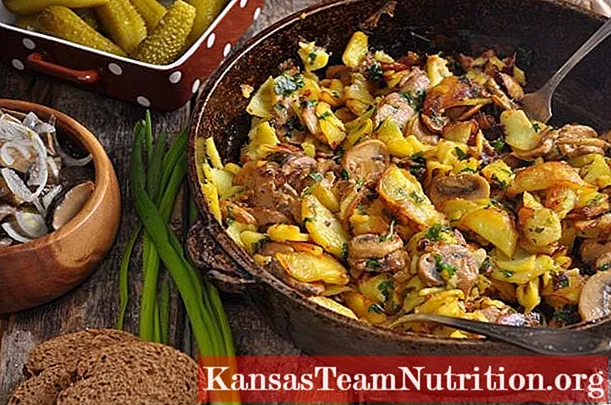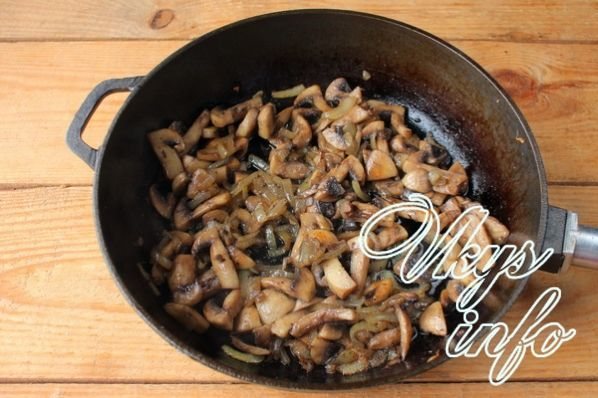 - Теперь положите на сковороду грибы (огонь не убавляйте), но помешивайте кушанье каждые пару минут.