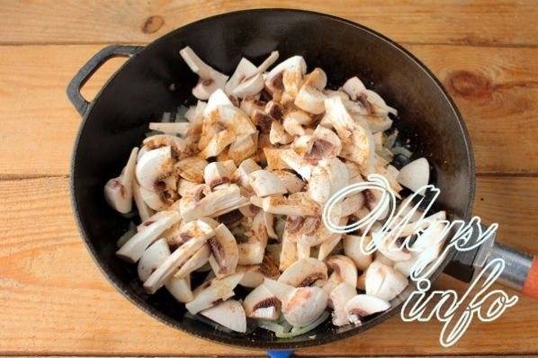Теперь выкладываем грибы. На них соль, приправу для грибных блюд. Тщательно перемешиваем и жарим на среднем огне. Помешиваем каждые 3-ри минуты.