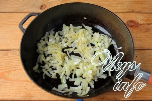 Когда грибы подготовлены, займемся луком. Порежем его не слишком мелко, лучше всего половинками колец или 1/4.Разогреем сковороду с растительным маслом, при этом огонь у нас должен быть средним, пассируем в нем до золотистого цвета приготовленный лук. Нам не надо чтобы он был совсем готов, достаточно чтобы на нем только начали появляться светло-коричневые полосочки. Это займет не более 2-х минут.