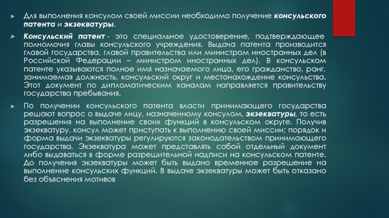 Слайд 8Для выполнения консулом своей миссии необходимо получение консульского патента и экзекватуры.Консульский патент –