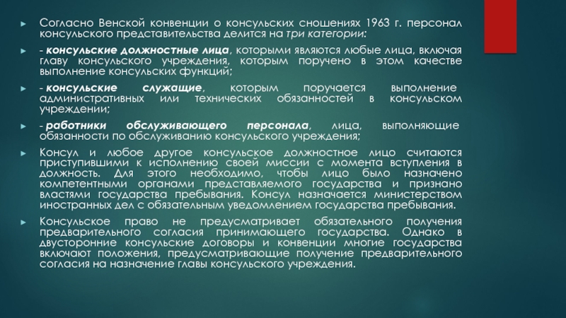 Слайд 7Согласно Венской конвенции о консульских сношениях 1963 г. персонал консульского представительства