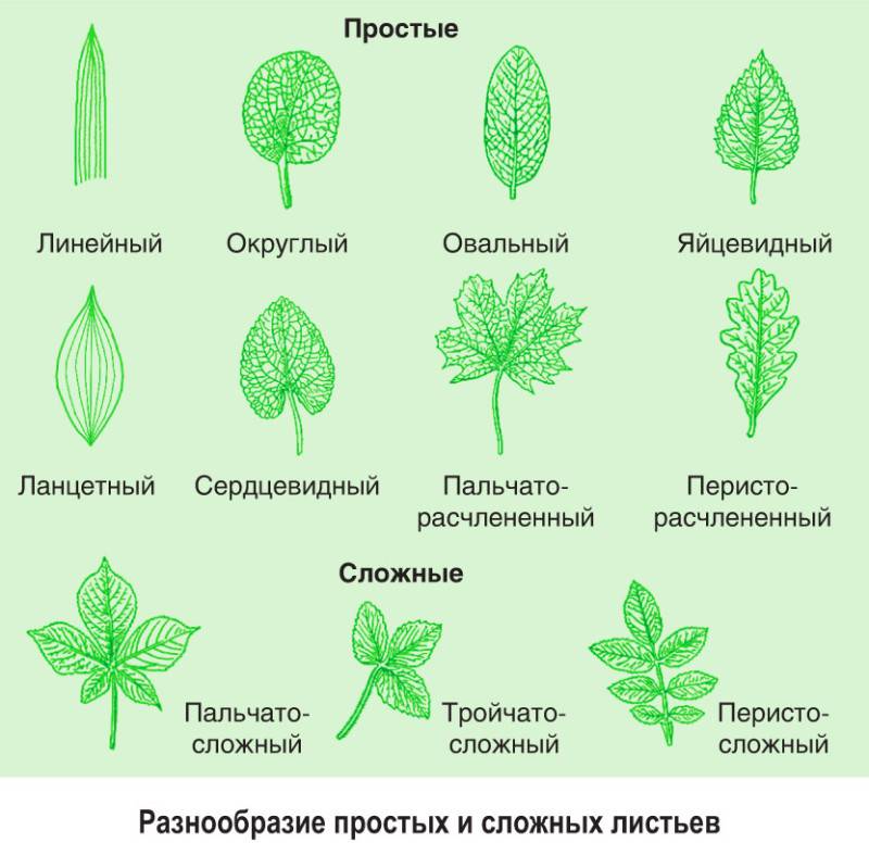 По внешнему строению листья разделяют на простые и сложные. У простых листьев одна листовая пластинка, а у сложных их несколько, и каждая может опадать по отдельности. Простые листья по форме листовой пластинки могут быть линейные, округлые, овальные, яйцевидные, ланцетные, сердцевидные, стреловидные, копьевидные, почковидные, а по характеру края листовой пластинки — пальчато- и перисторасчлененные. Сложные листья по характеру расположения листовых пластинок разделяются на пальчатосложные (каштан, люпин), тройчатосложные (клевер, земляника) и перистосложные (рябина, горох).