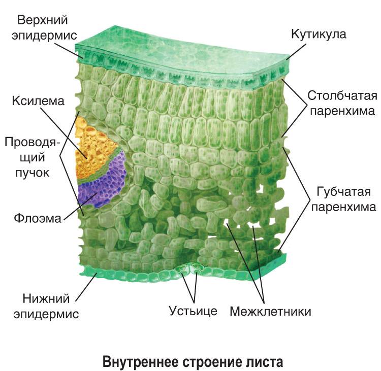Внутреннее строение листа хорошо видно под микроскопом на поперечном срезе листовой пластинки. Снаружи лист покрыт эпидермисом. У горизонтально расположенных листьев различают верхний и нижний эпидермис. На верхнем эпидермисе имеется кутикула, восковой налет или опушение, в нижнем эпидермисе находятся устьица. Функцию фотосинтеза в листьях выполняет в основном столбчатая паренхима. Она лежит под верхним эпидермисом и состоит из одного или двух рядов плотно расположенных вытянутых клеток, содержащих много мелких хлоропластов. Под столбчатой паренхимой находится губчатая паренхима с большими межклетниками, состоящая из округлых клеток, содержащих небольшое количество хлоропластов. Она выполняет функции газообмена и транспирации. В листьях тенелюбивых растений столбчатая паренхима отсутствует. Внутри листа находятся проводящие пучки (жилки), которые выполняют не только проводящую функцию, но и функцию опоры для мягких тканей листа.