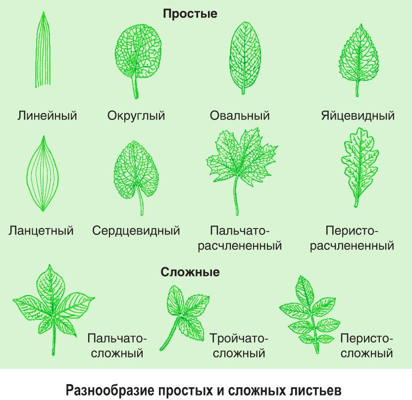 По внешнему строению листья разделяют на простые и сложные. У простых листьев одна листовая пластинка, а у сложных их несколько, и каждая может опадать по отдельности. Простые листья по форме листовой пластинки могут быть линейные, округлые, овальные, яйцевидные, ланцетные, сердцевидные, стреловидные, копьевидные, почковидные, а по характеру края листовой пластинки — пальчато- и перисторасчлененные. Сложные листья по характеру расположения листовых пластинок разделяются на пальчатосложные (каштан, люпин), тройчатосложные (клевер, земляника) и перистосложные (рябина, горох).