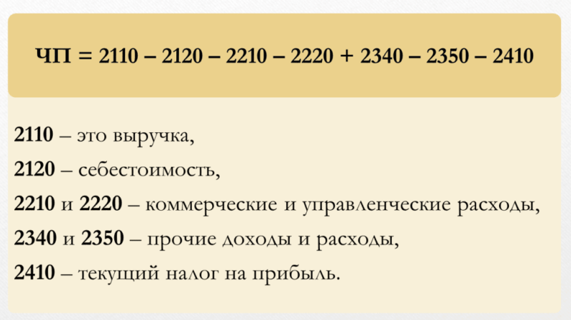 Законодательство не содержит официально утвержденных методик расчета показателя, но сама схема есть в форме отчета о финансовых результатах. Классическая формула чистой прибыли такая: