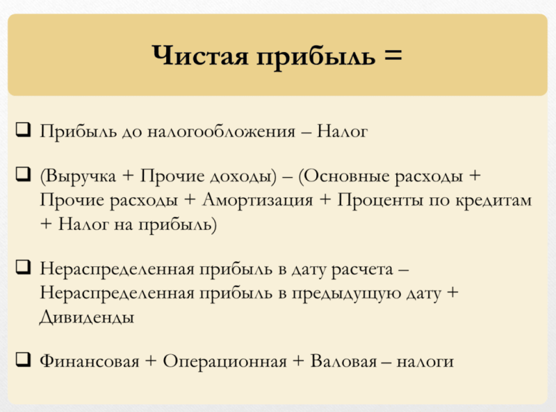 Также чистую прибыль можно рассчитать и по другим формулам: